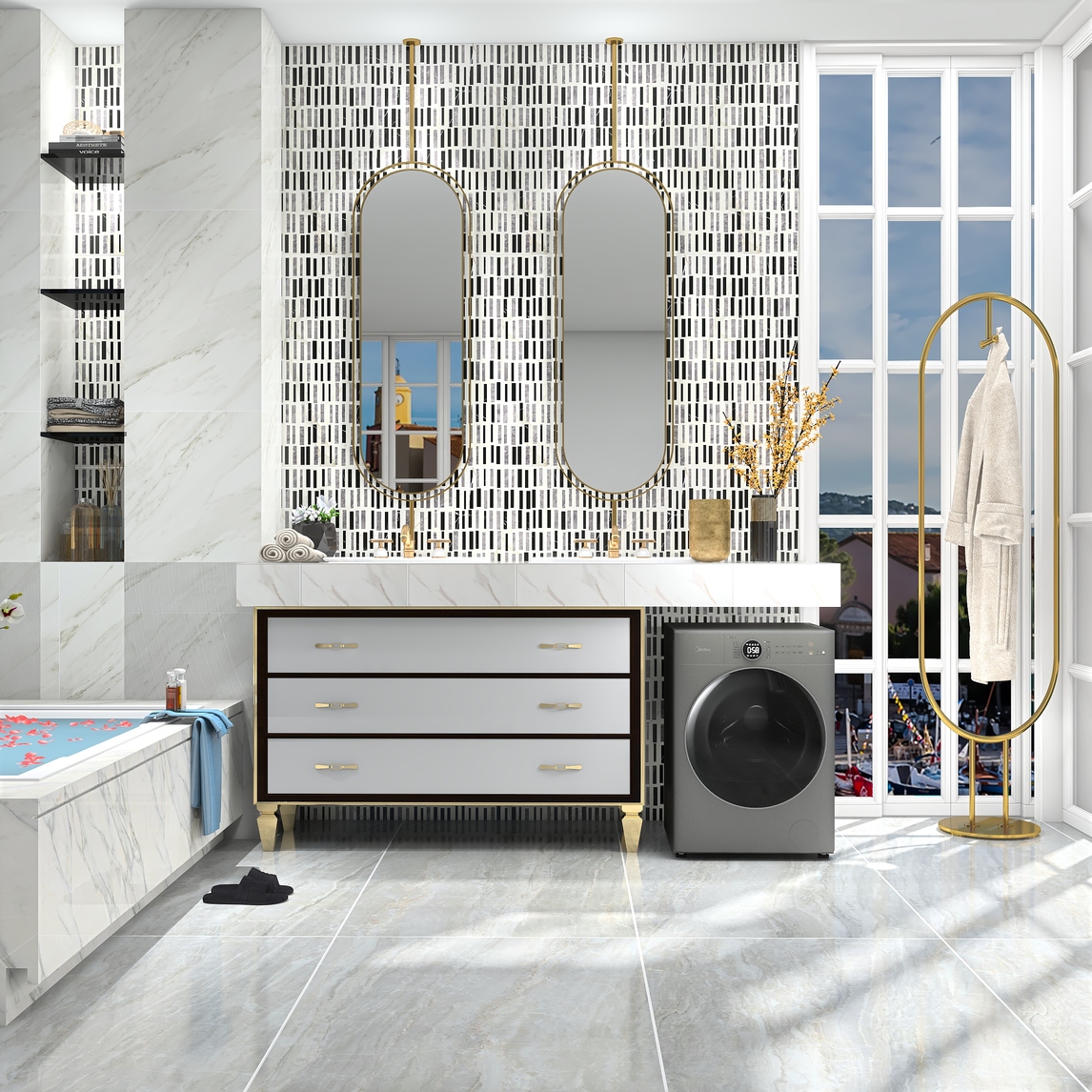 卫生间采用简单的线条搭配金色金属装饰,打造出优雅又精致的简美小资格调的卫浴间。南北通透的玻璃窗,加上经典温馨的配色,让卫浴空间时尚中不乏大气质感。
