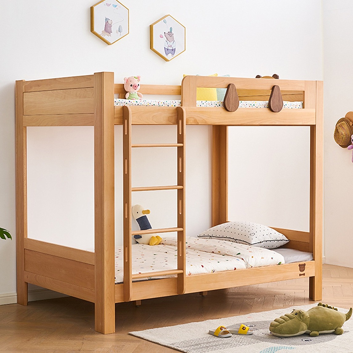 规整的上下床,显得整洁利落,有板有眼的。加粗床柱,保证上下床结实稳固,就算顽皮的孩子在床上跑跳也不会塌陷。