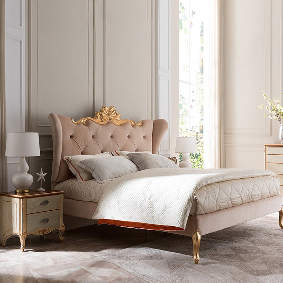 欧式风的布置很有轻奢公主风的即视感,今天来一组卧室的布置,看双人床是新古典法式轻奢大床,可以体现出主人对高品质的生活追求,搭配金色的床头点缀很吸人眼球给你的居家感受,加上实木雕花床头柜很有精致感哦。