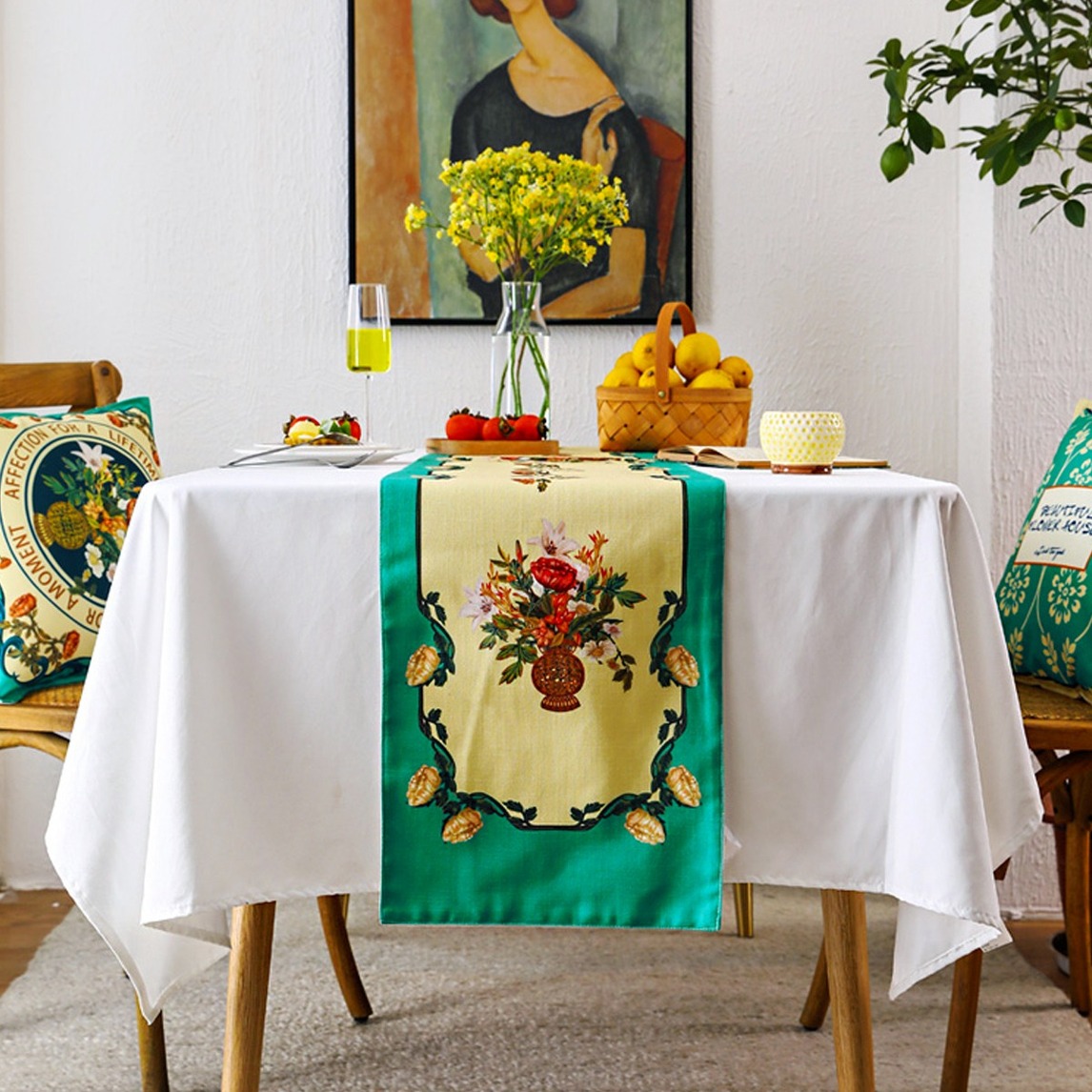 实木材质的餐桌椅搭配简约的白色桌布,本是典型的北欧风格,大胆的将复古印花图案的桌旗铺在桌布上,以同色系的抱枕和装饰画点缀,北欧与复古风形成对比,复古风软装让北欧风更加精致了。
