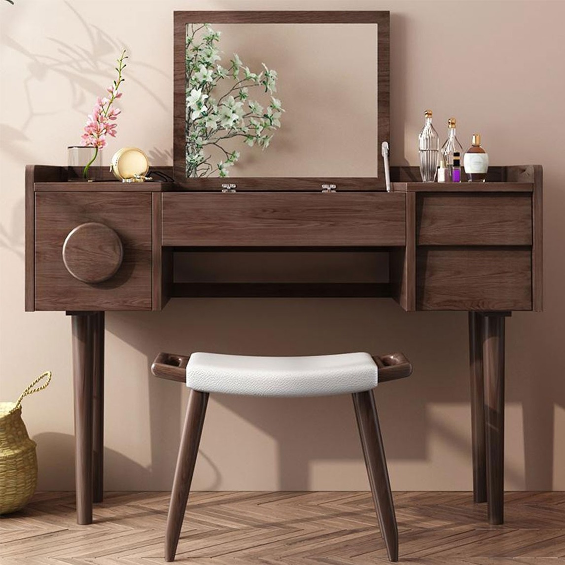 梳妆台整身全部采用优质的高级多层实木板材,十分环保耐用。而且还设计了个性的储物空间,为化妆品收纳量身打造。