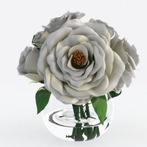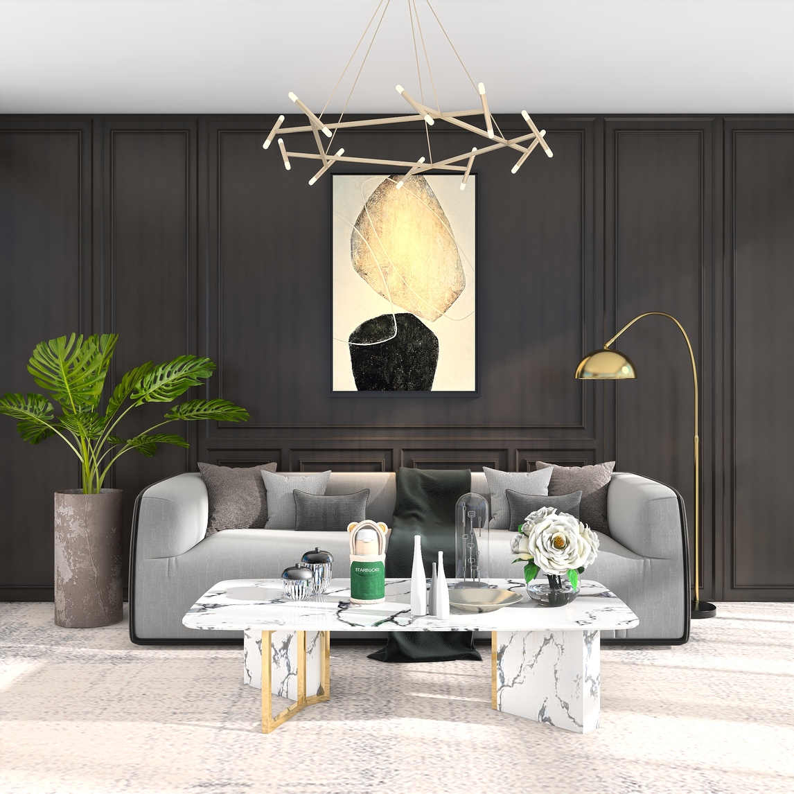 灰色地毯与深木色墙壁的搭配,灰色布艺沙发,爵士白配金属线条大理石茶几,辅以白色玫瑰球的鲜活点缀,让空间尽显高级格调。