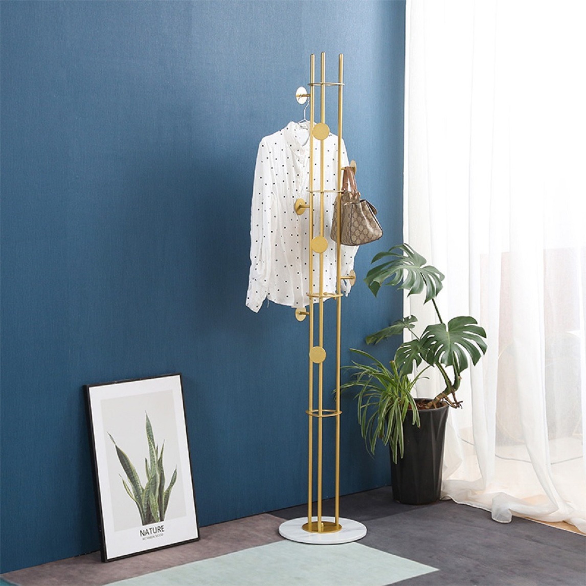 这是一款很有设计感的北欧轻奢风衣帽架,摆放在卧室能营造时尚气息。挂钩是可以调节高度的,衣物挂在上面也很有层次感。