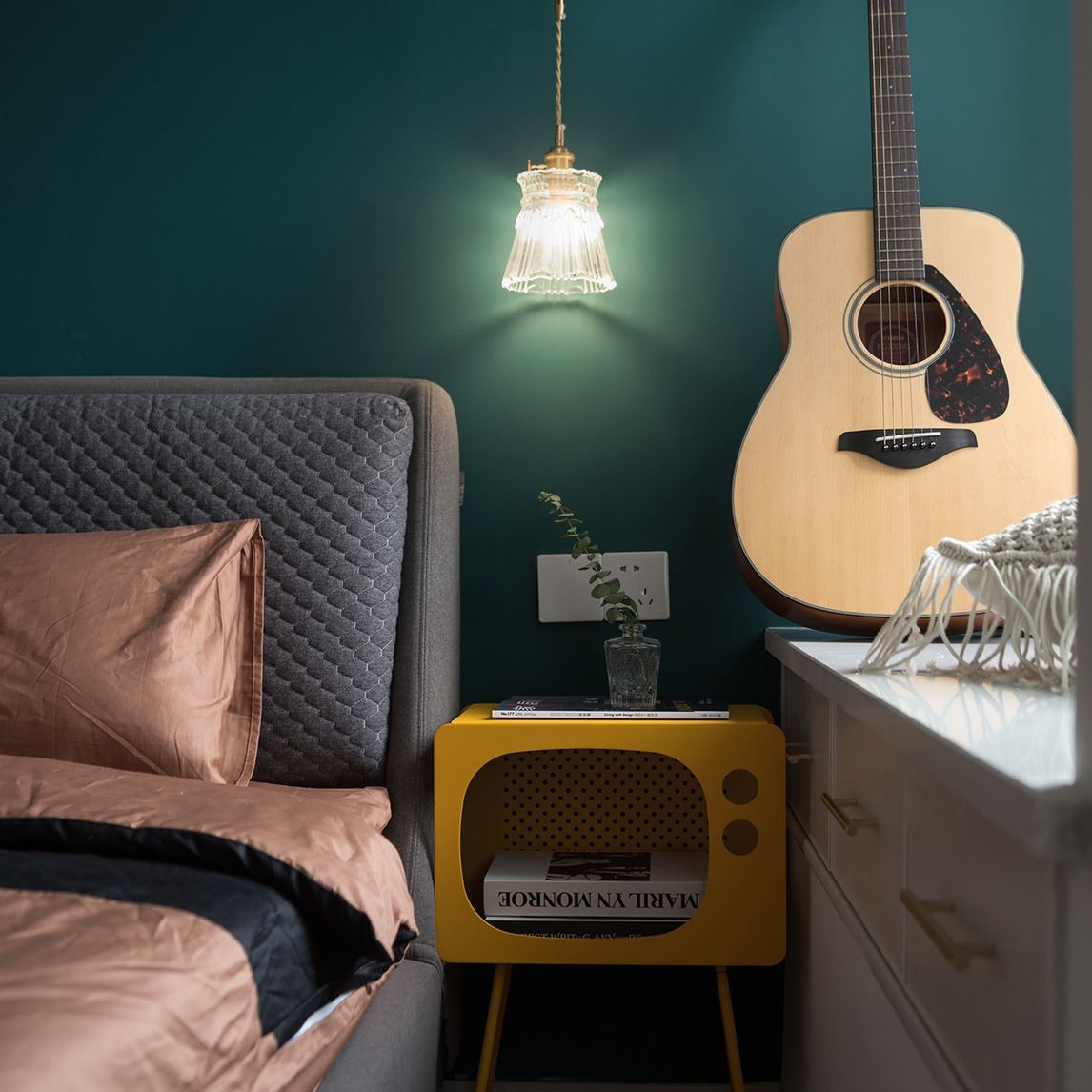 喜欢复古的亲们,一定不能错的墨绿色,将卧室的背景涂刷成墨绿色,低调中透着淡淡的高级感,搭配一盏复古玻璃壁灯,倚靠在床头,享受这淡淡的复古味道。