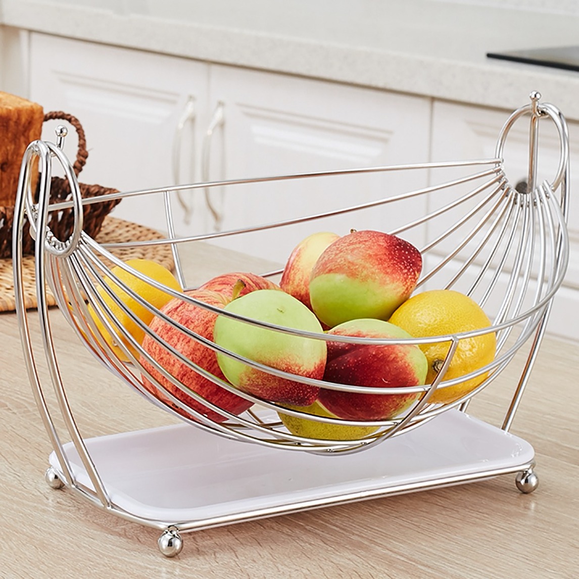 这是一个很有创意的果盘,带有可以接水的盘子,将水果洗好之后放在里面,不担心弄湿桌子,它还可以随意摇摆呢。