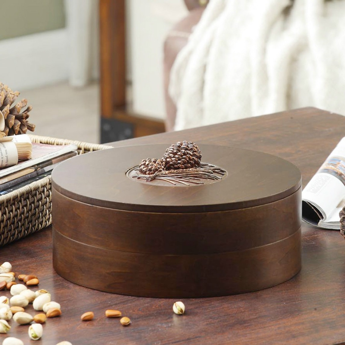 实木材质的果盒,精美的雕刻盖子,精美实用,纹理美观,承载食物健康,底部有旋转轴,方便使用,提高生活品味。