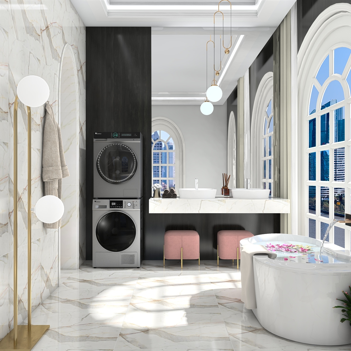 轻奢风格的卫浴间,处处洋溢着高档华贵的气质,对比强烈的黑灰色、白色和皮粉色,都在诉说着自己审美品味。同样带来奢华洗衣体验的是小天鹅,10KG洗衣机烘干机洗烘套装,高定的洗烘套装,轻柔呵护衣物,物理去渍...展开