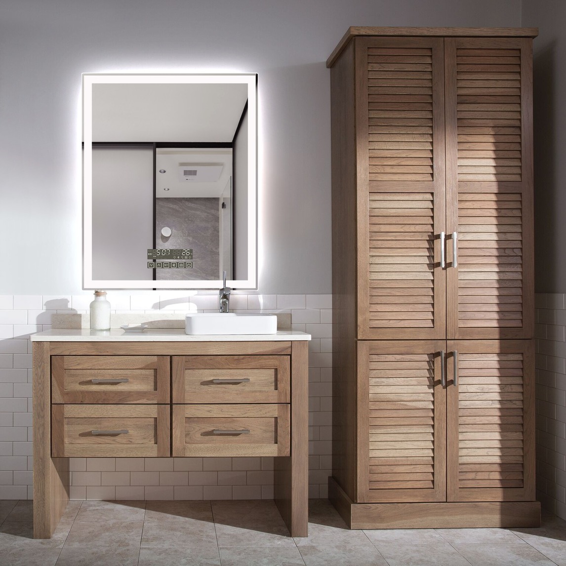在浴室的空间中脱颖而出,一个智能灯镜搭配的台上盆,再加上一个立式的储物柜,形成了一个比较小型而且很简约味道的洗手间;