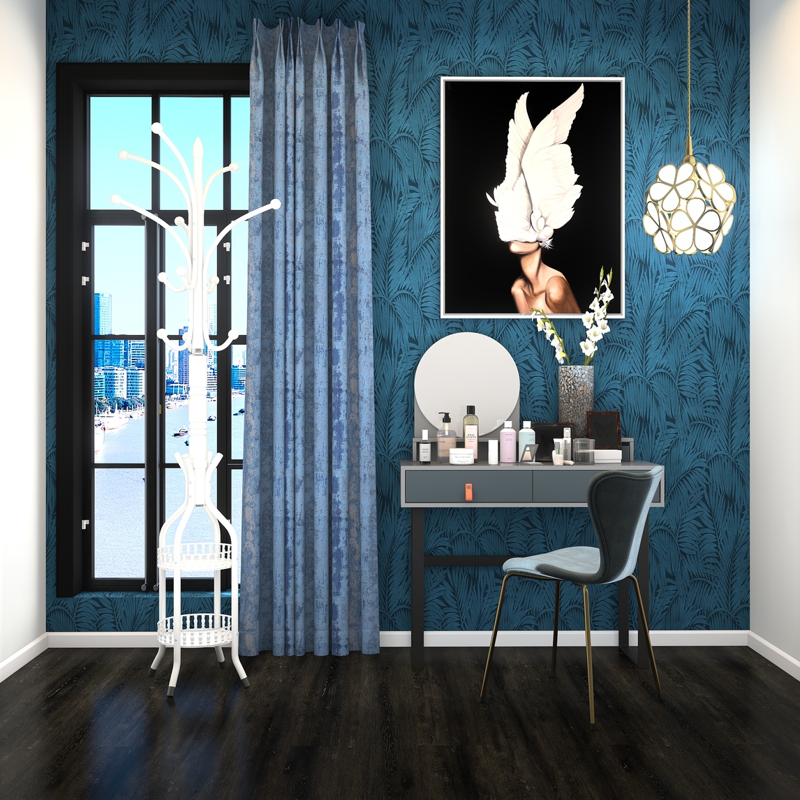 带有一点美式复古风格,整体还是以现代简约为主。每个女孩都希望有一个自己的梳妆台,背景采用花纹壁纸,更是让人沉迷的颜色以及花纹的搭配。
