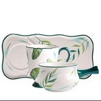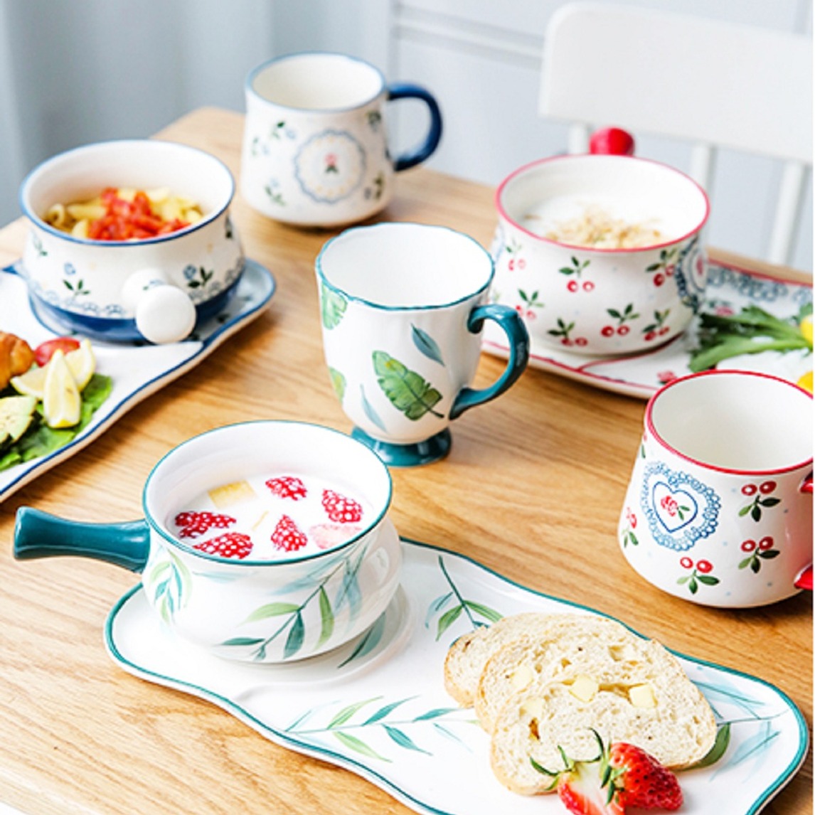 这款早餐餐具的釉色清新靓丽,起伏的花型波浪边缘浪漫优雅,手工花卉图案,百花绽放,让餐具生机盎然,用这样的餐具吃早餐一定会食欲大增的吧。