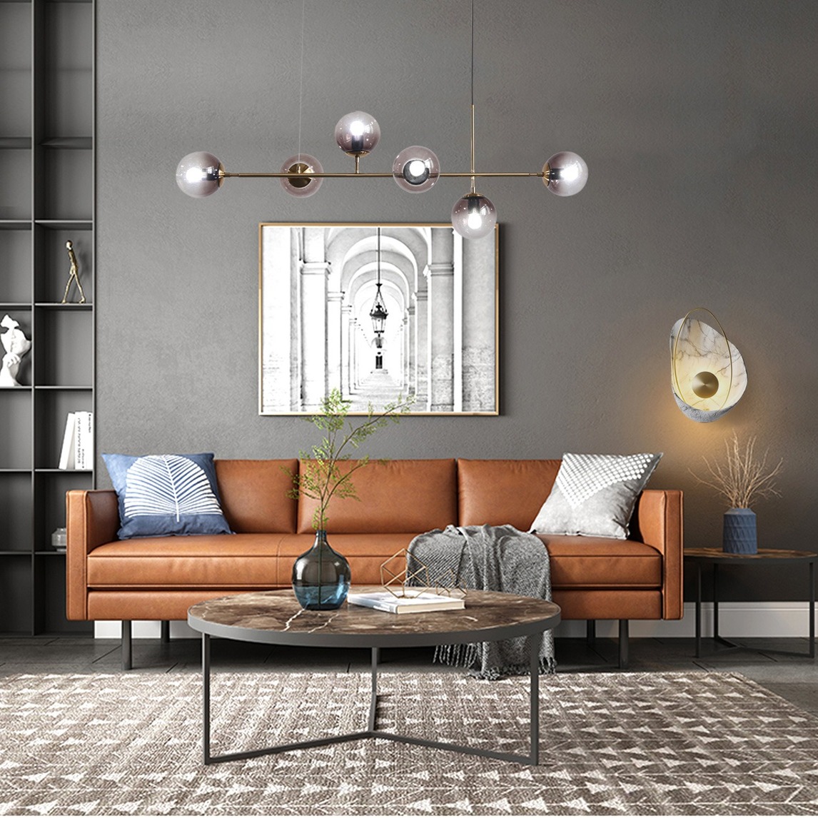 这个房间的设计以灰色为主,干净简约又平静。软装上搭配了红棕色的沙发,以及在茶几和灯具的选择上融入了大理石元素,让空间又显得温馨起来,确认过了,是家的感觉。