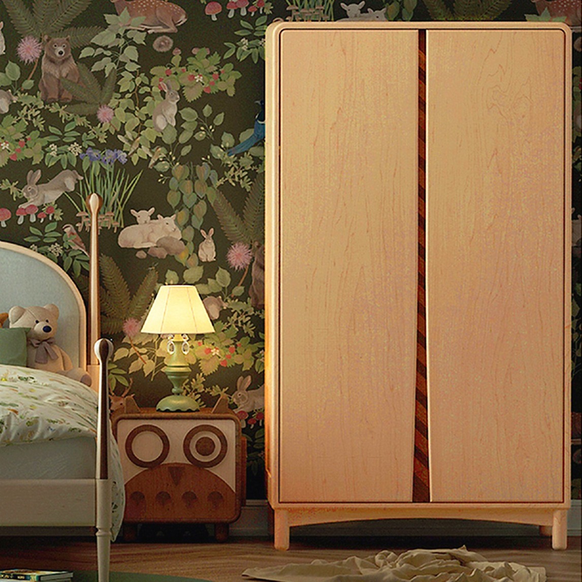 将美式风格与北欧风格融合在一起,儿童房混搭风,更加迷人。动物森林般的壁纸,搭配原木色衣柜,活泼可爱。