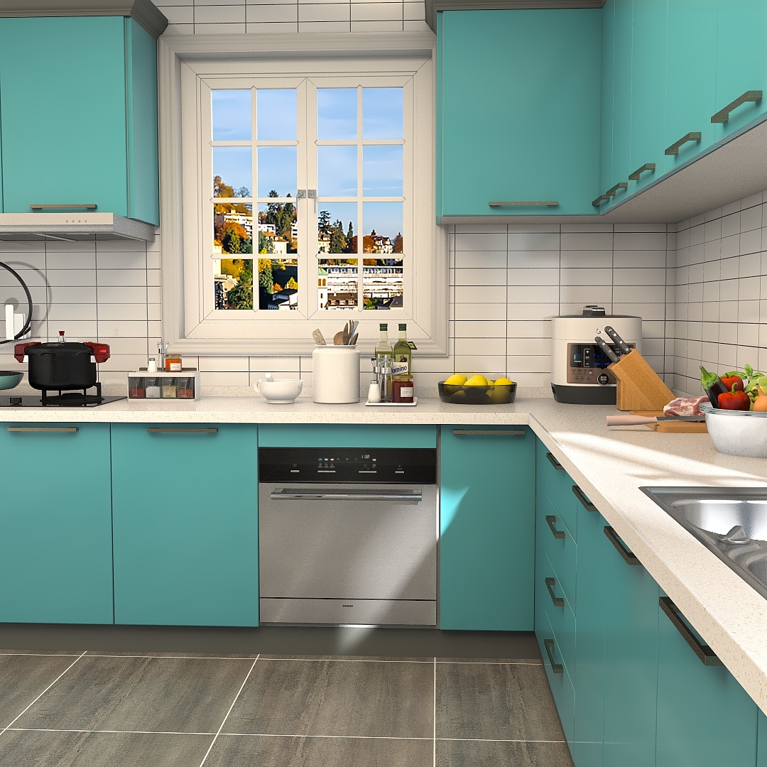 蓝色的橱柜色调,白色小条的背景墙贴,让整个厨房显得更加清新干净,大气简约。地面用灰色调地贴装饰,耐脏又显层次感。