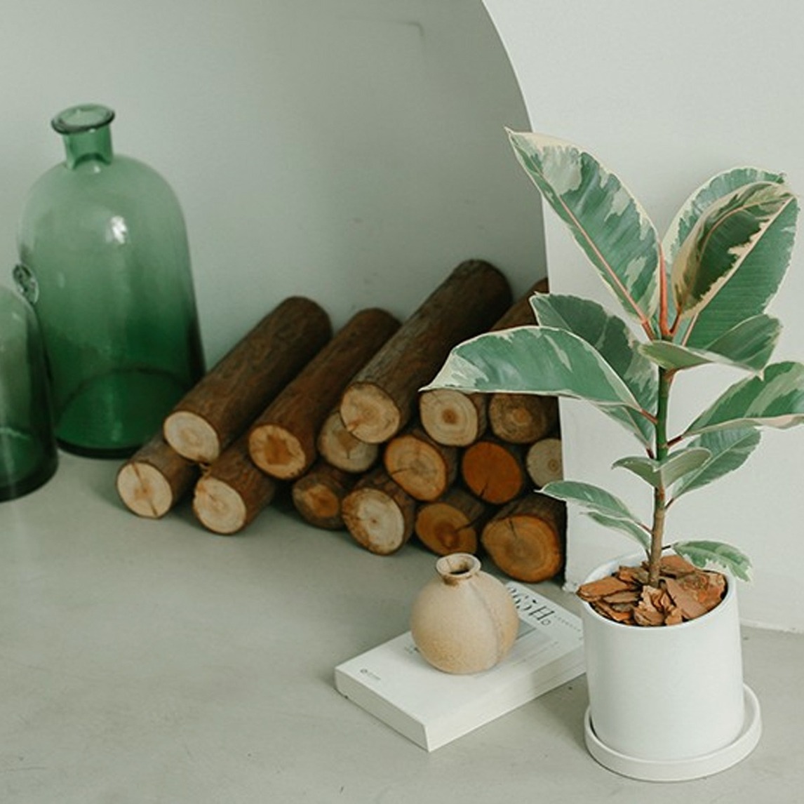 想要复古风家装,水泥色的地面或者墙面是必不可少的元素。而看起来越是随意的装饰,就越是有复古风的感觉。在墙面摆放一排木头道具,复古的半透明绿色花瓶,看起来像仿真花的盆栽,清新自然的田园复古风。