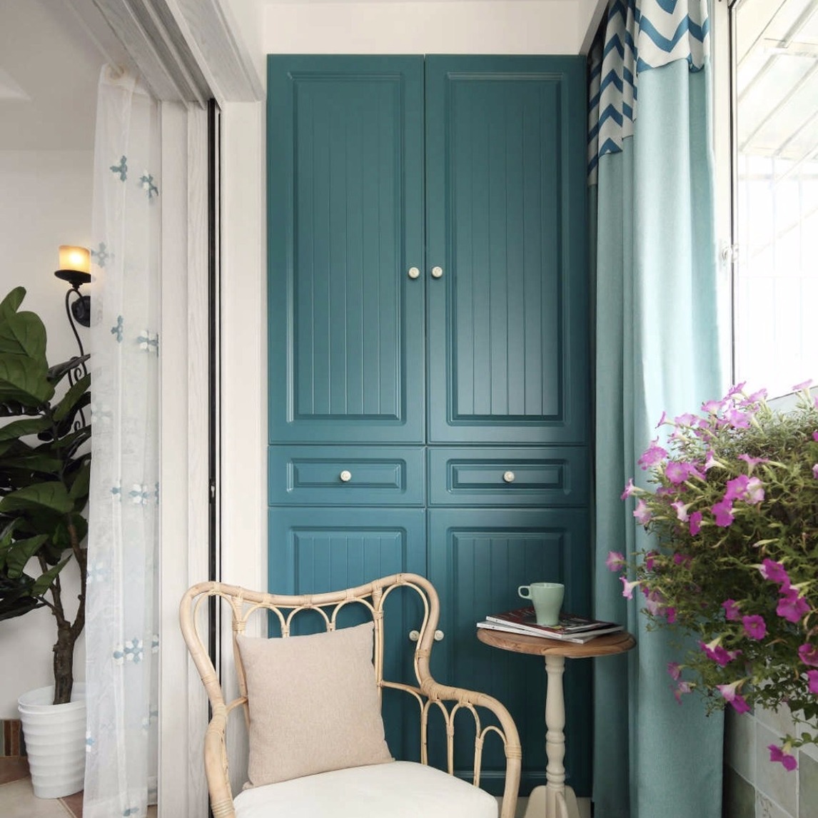 高颜值的休闲阳台摆放一款藤编休闲椅,散发出满满的大自然格调。旁边再摆放一款美式圆几,又带点新中式的韵味。这样的阳台怎么可以少了一盆绿植来作为装饰,营造出生机勃勃的气息。再搭配一款白色纱帘,为居室带来一...展开