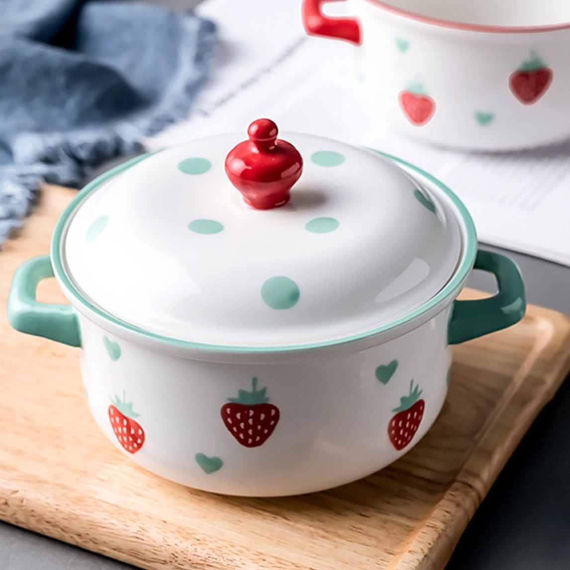 萌趣 可爱的锅身设计,搭配多样化的盖子,整个面碗极具看点,搭配可爱的草莓图案,精致简约,真的是让人爱不释手啊。