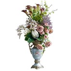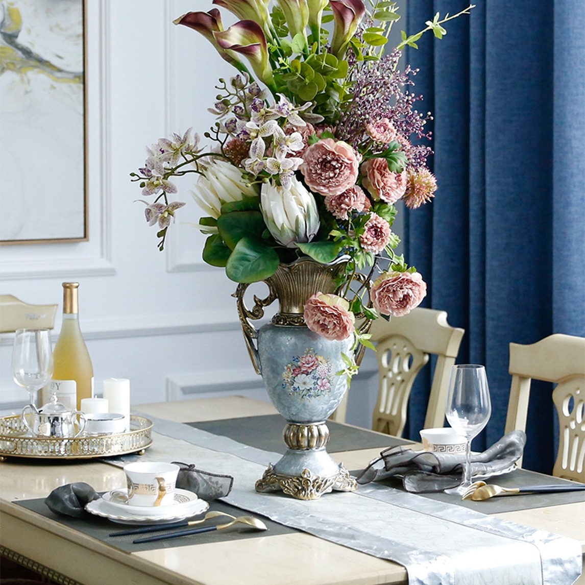 色彩丰富的仿真花花艺摆件,花形立体饱满,叶脉清晰,色泽过度自然,搭配上欧式陶瓷花瓶,让家居生活更有格调。