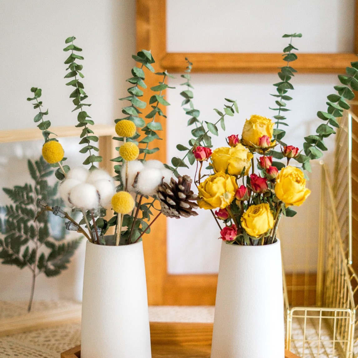 鲜花保存时间不长,干花装饰更显得有艺术感,是文艺小清新的最爱。尤加利枝配上小棉花,加上一点色彩小花就很好看了。