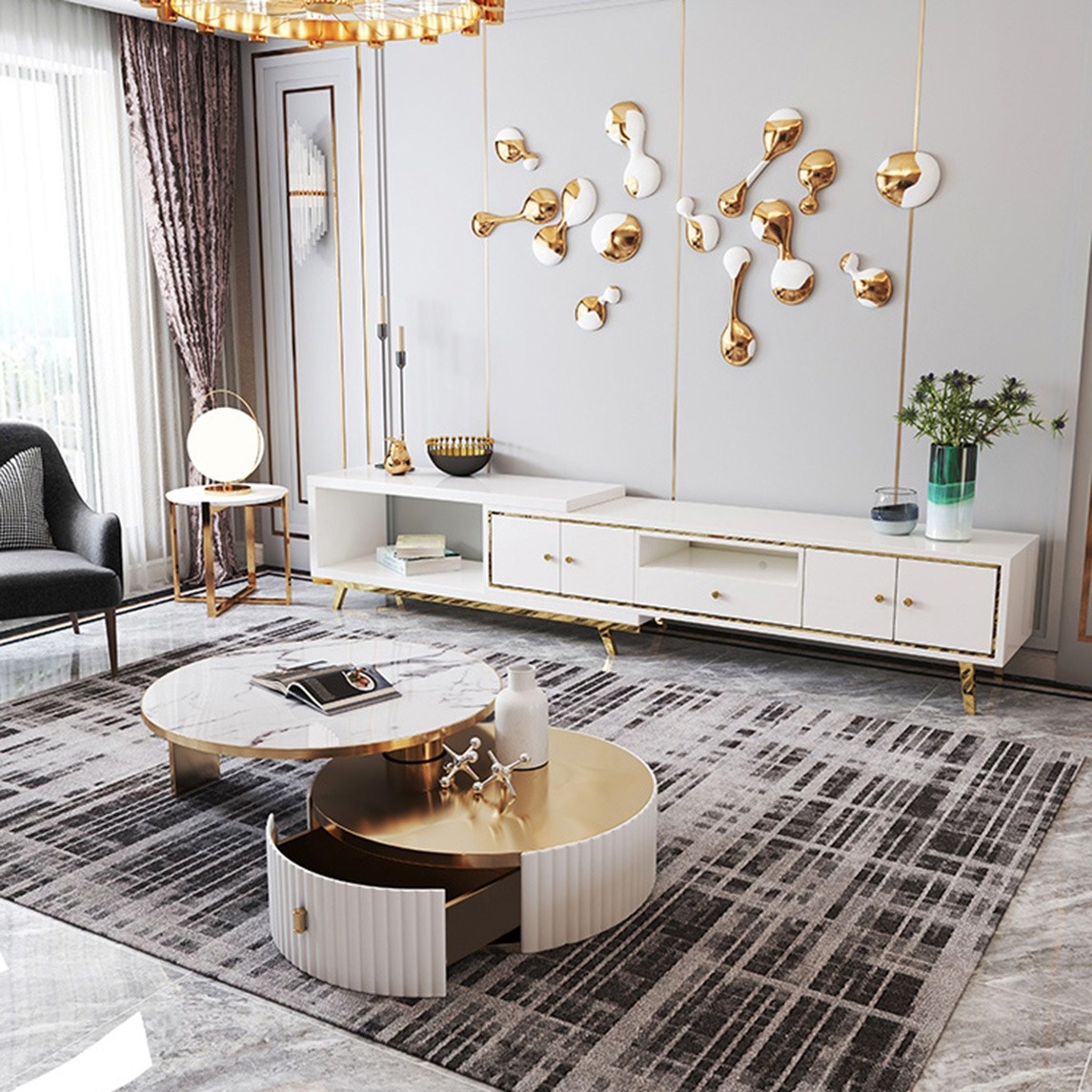 后现代客厅空间以简约风格来营造空旷感,米白色的电视柜与金色装饰画相对,使空间提亮,简洁的金色吊灯与金色的摆件,整个客厅的布置虽然简单但氛围非常舒适。