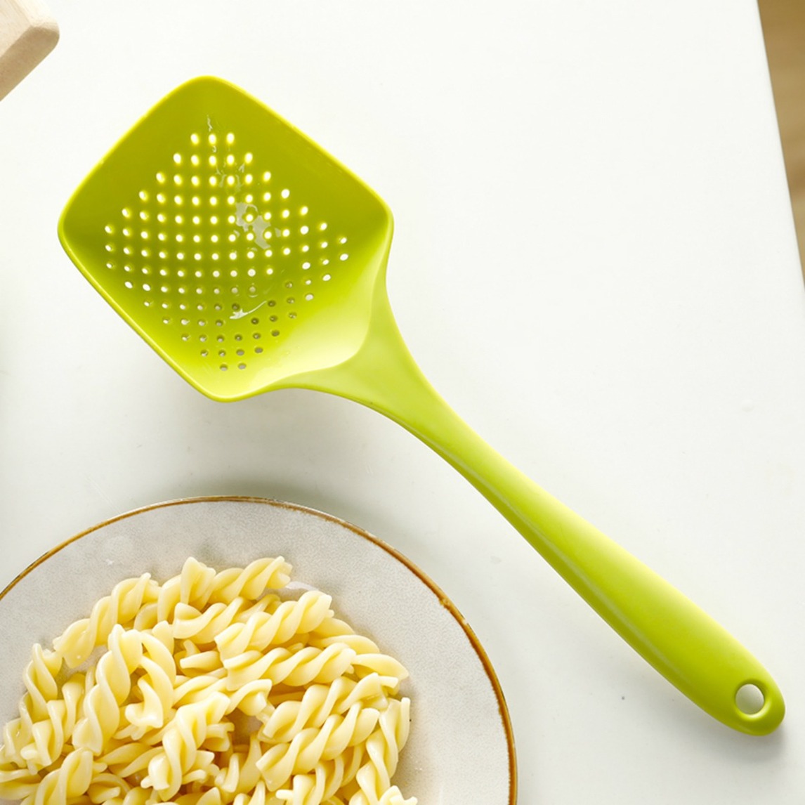 密集大孔均匀分布,快速滤去多余水分,节省时间,采用尼龙材质打造,源于日本进口制作工艺,做工细致,边缘光滑,不伤锅具。