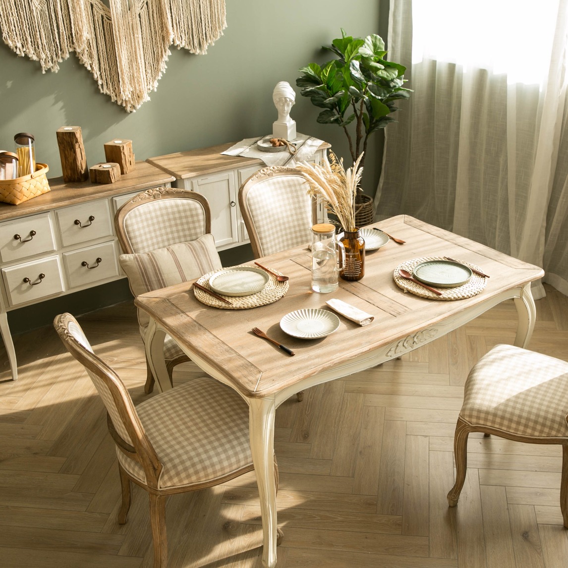 美美的家具能一定程度上改变就餐的心情。所以餐桌在选择上,可以采用这种法式风的类型,更具特色。选用桦木的材质,高端大气上档次。精美的纹理,完美散发着复古的感觉。边缘的地方融合做旧处理,质感非常强。餐桌的...展开