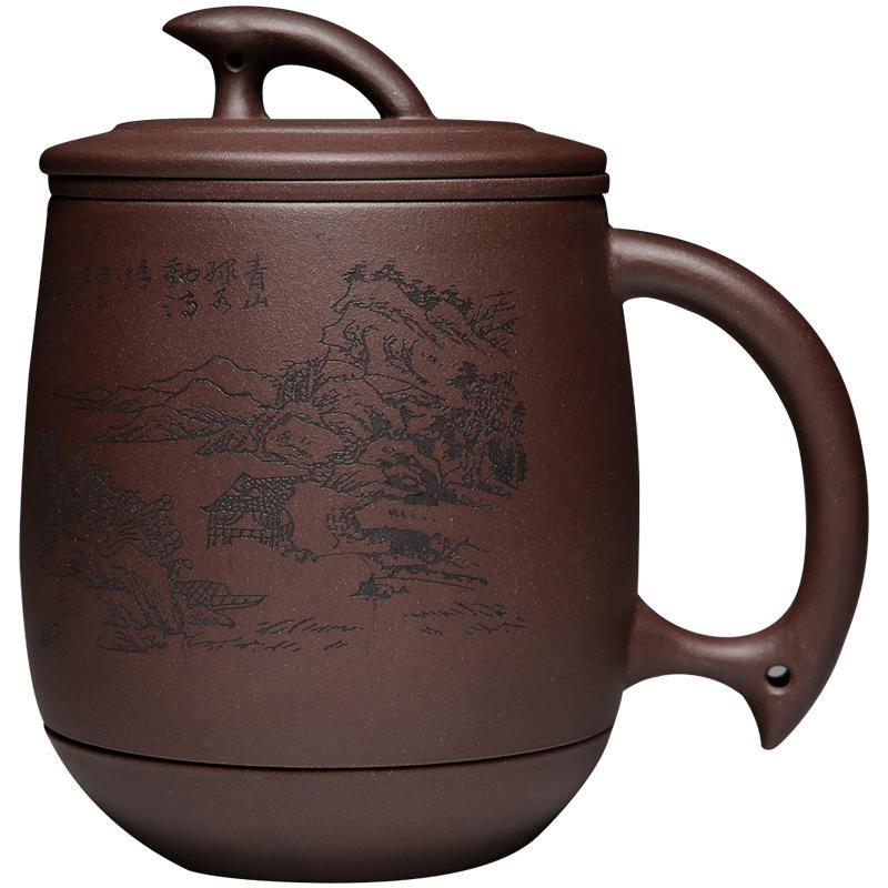 这是一款值得收藏的紫砂杯!一杯四件:杯盖、内胆茶漏、杯身、杯底。杯把新颖别致,曲张有度,与杯身衔接流畅自然,端拿更舒适。