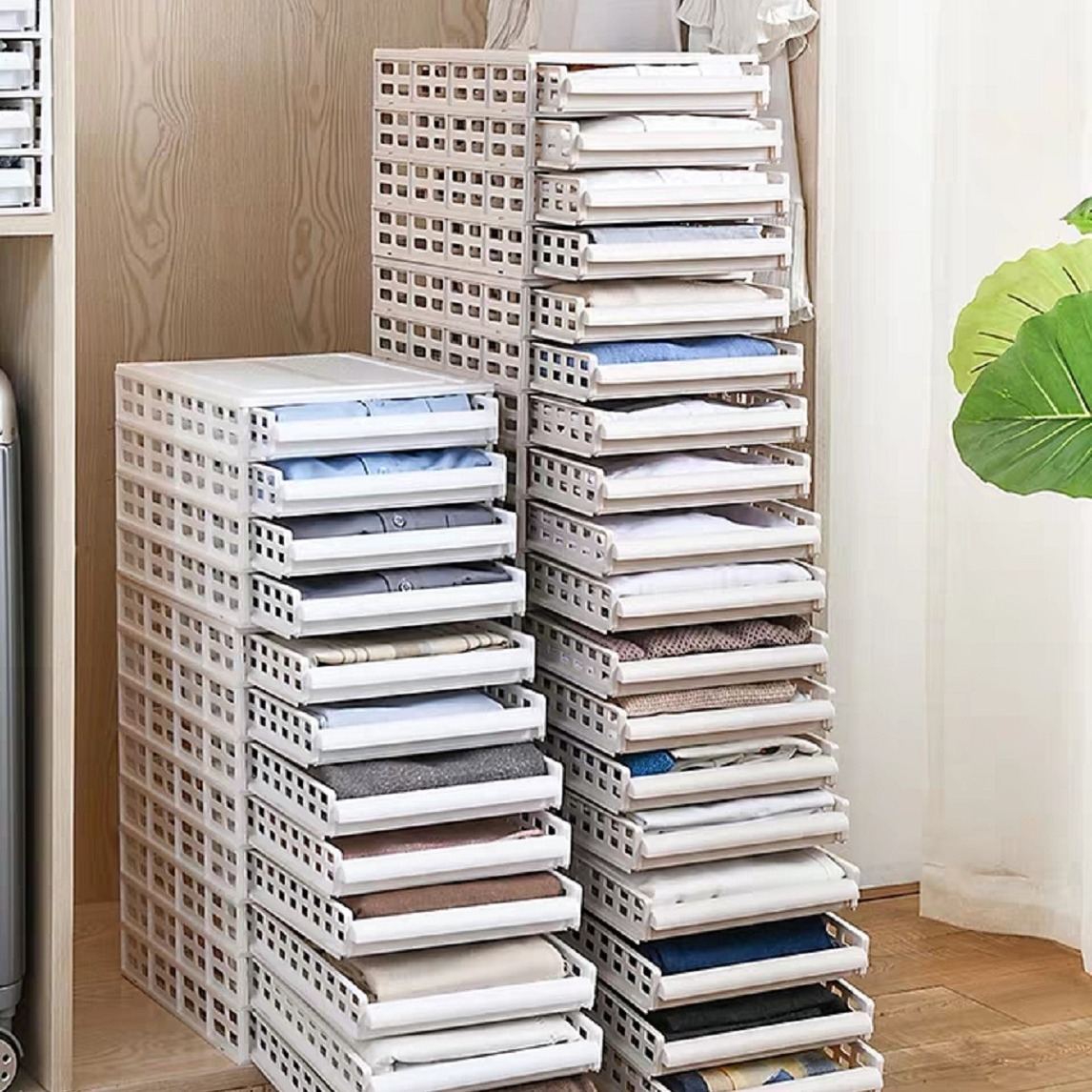 抽屉式衣物收纳柜,一层一物,叠放更省空间,滑动轨道,抽拉顺畅,想拿哪件衣服就能轻松找到,叠加稳固,放置不易倾倒,层层叠加,有它更剩空间。
