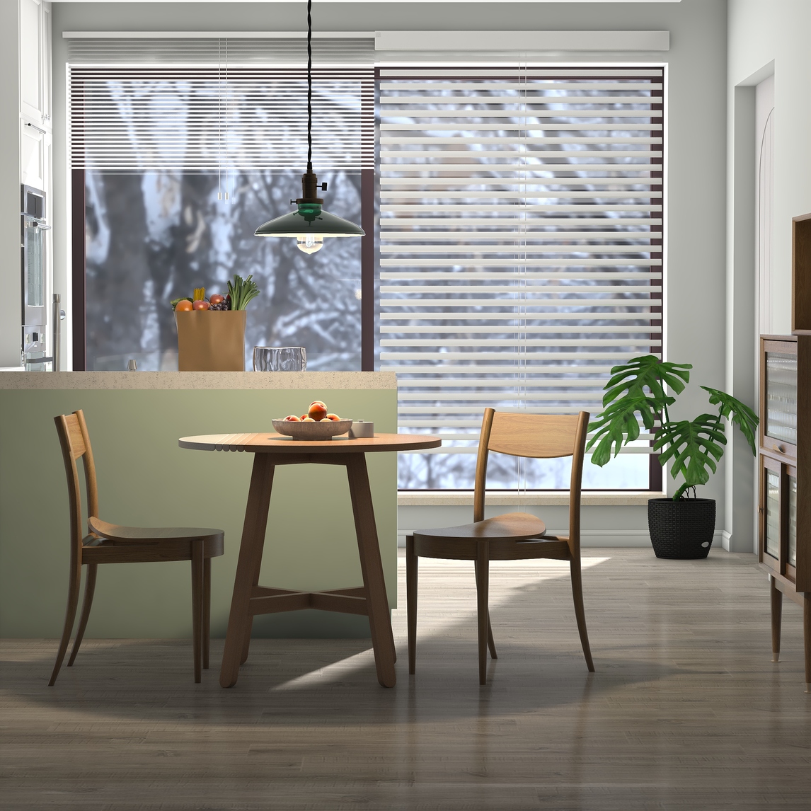 清新的薄荷绿,搭配原木色,你家里也能拥有北欧的场景,小空间,两人宅在几家里,开放式厨房的家具选择,吱音的圆桌搭配两个靠背椅子。