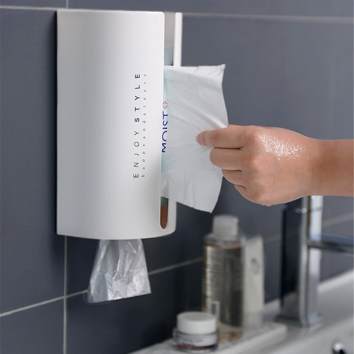 免打孔的纸巾盒挂架还挺实用的,既能放纸巾又能放垃圾袋,而且安装在墙面上也不会占用空间,多种不同尺寸的纸巾都可以使用。