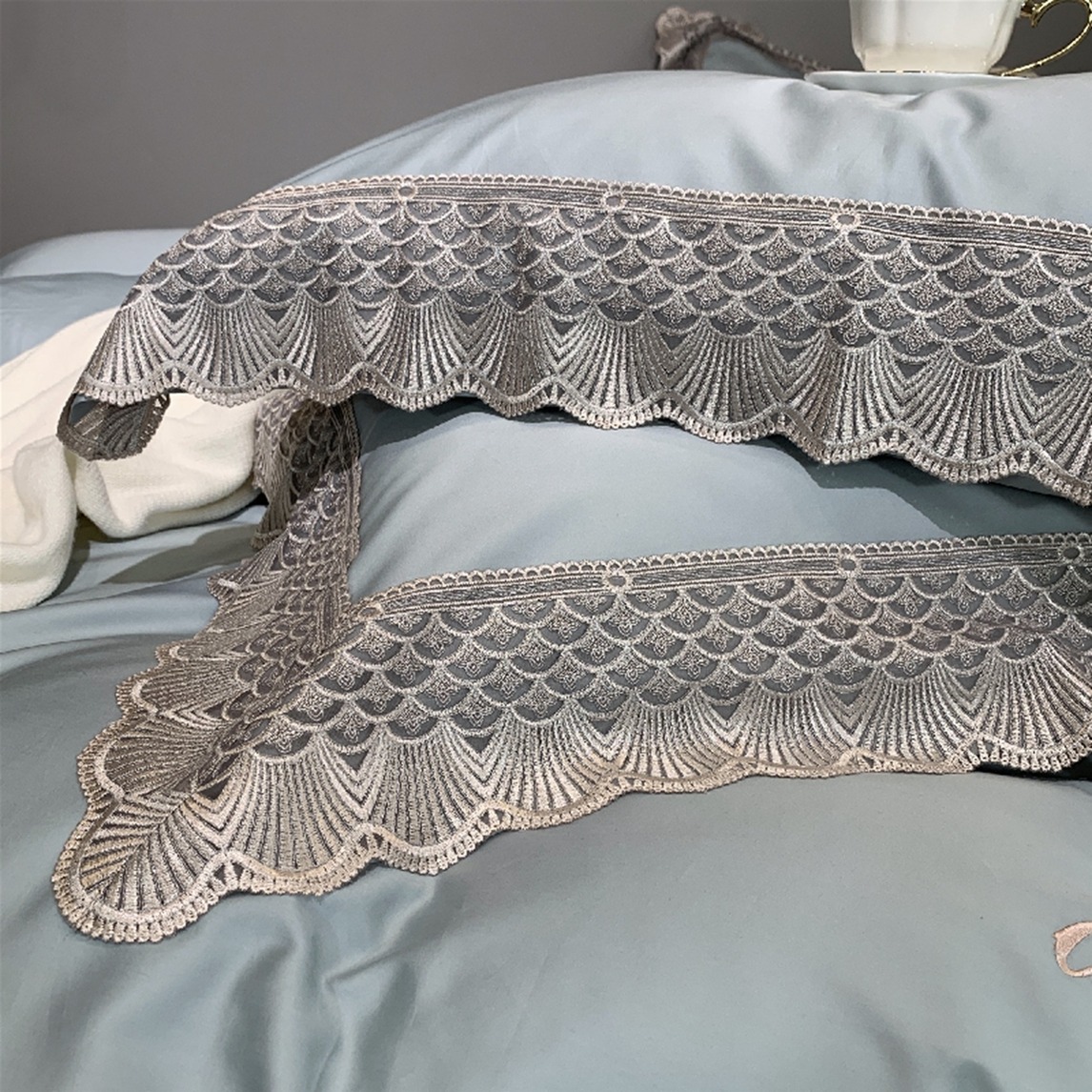 简约80S长绒棉刺绣柔软四件套,采用优雅的蓝色调设计,搭配上精美的蕾丝花边点缀,提升了卧室的时尚感。