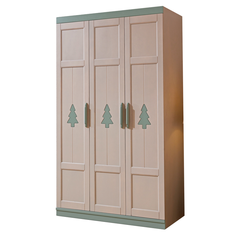 家有萌宝的话,我建议给他们的卧室弄得更童真一些他们会比较喜欢的,放一个这样的实木衣柜,孩子们会喜欢的,童趣的设计,柜门把手附近上面还有树木,色彩绚烂一些他们会喜欢。