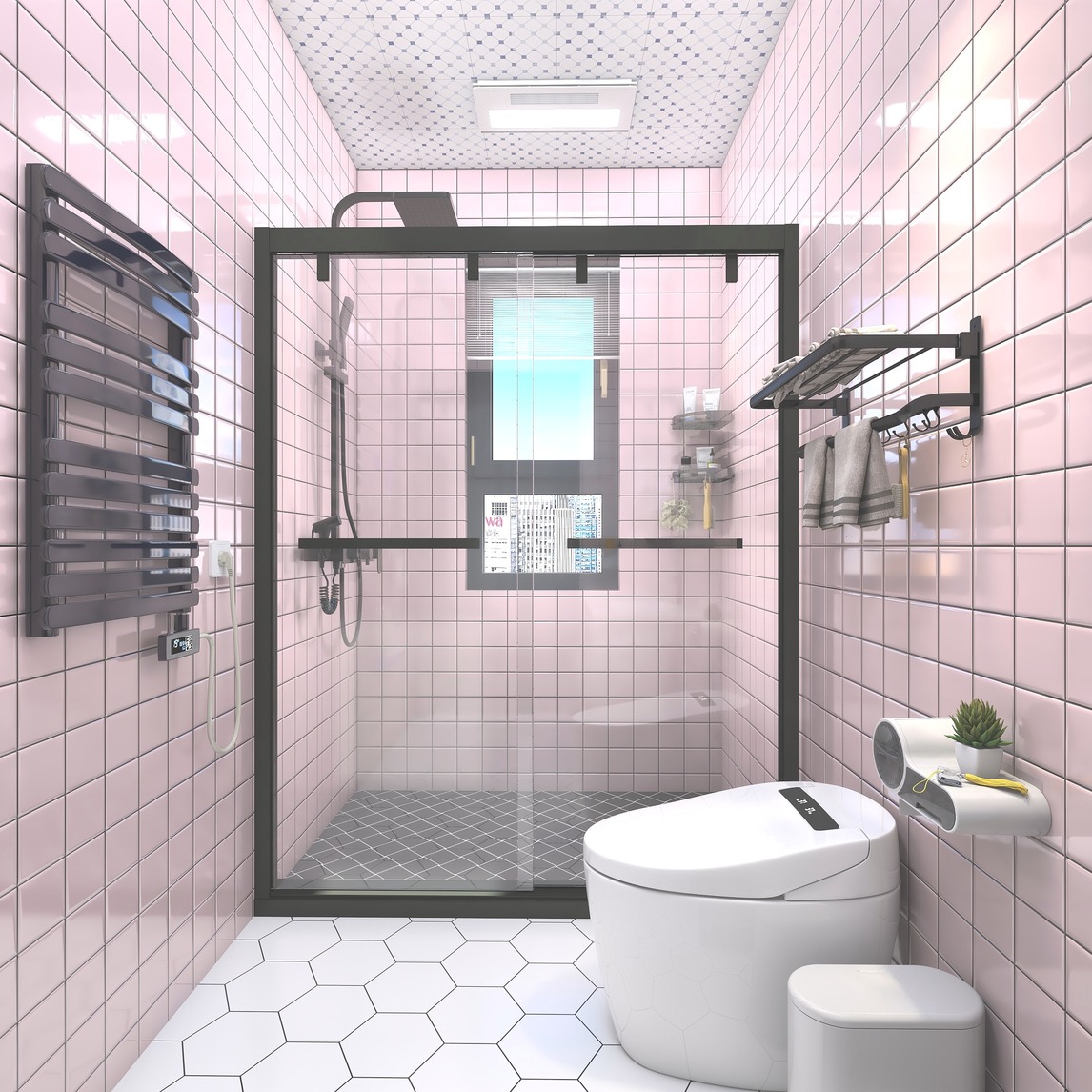 该卫生间不算很大,我采用了干湿分离的方式来设计,这样不仅增加美观更实用。墙面采用粉色釉面砖,地面是六角形的白色釉面砖,拉伸空间感,墙地面砖的颜色对比比较强烈,视觉上会给人舒适感。智能马桶也是增加人们后...展开
