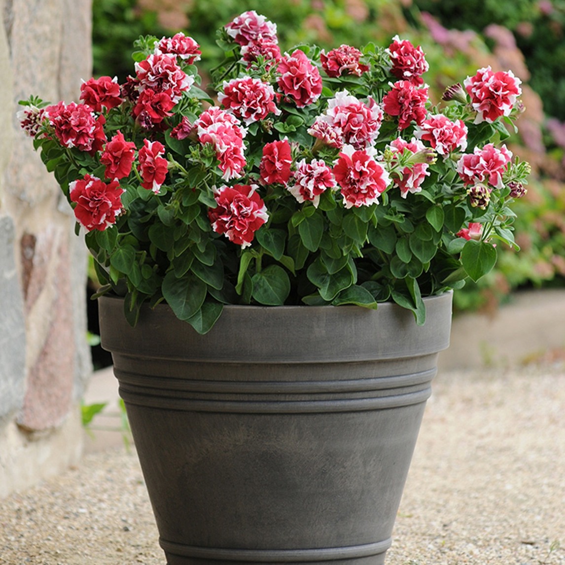 多花重瓣矮牵牛,花茎5-5.5厘米,花色丰富,花型整齐一致,且花开早分枝好,株型紧凑,很适合盆栽吊篮和花坛种植,20厘米盆,3颗即可达到满盆效果。