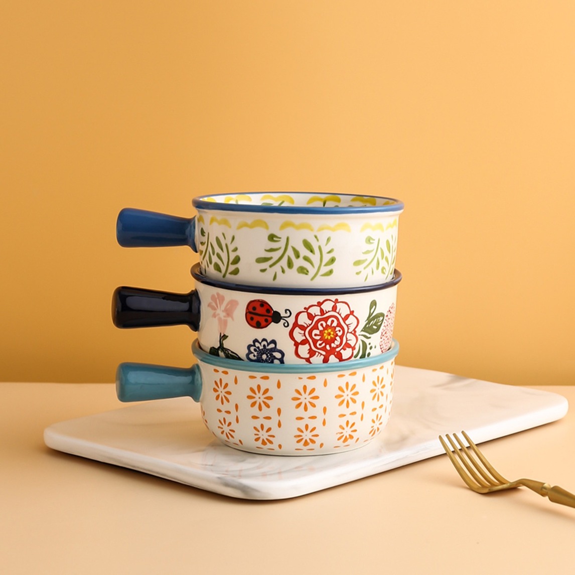 釉下彩可爱手柄碗,造型讨喜,图案清新,多种花色各有风情,用来盛放美食再适合不过了,满足你的日常需求。