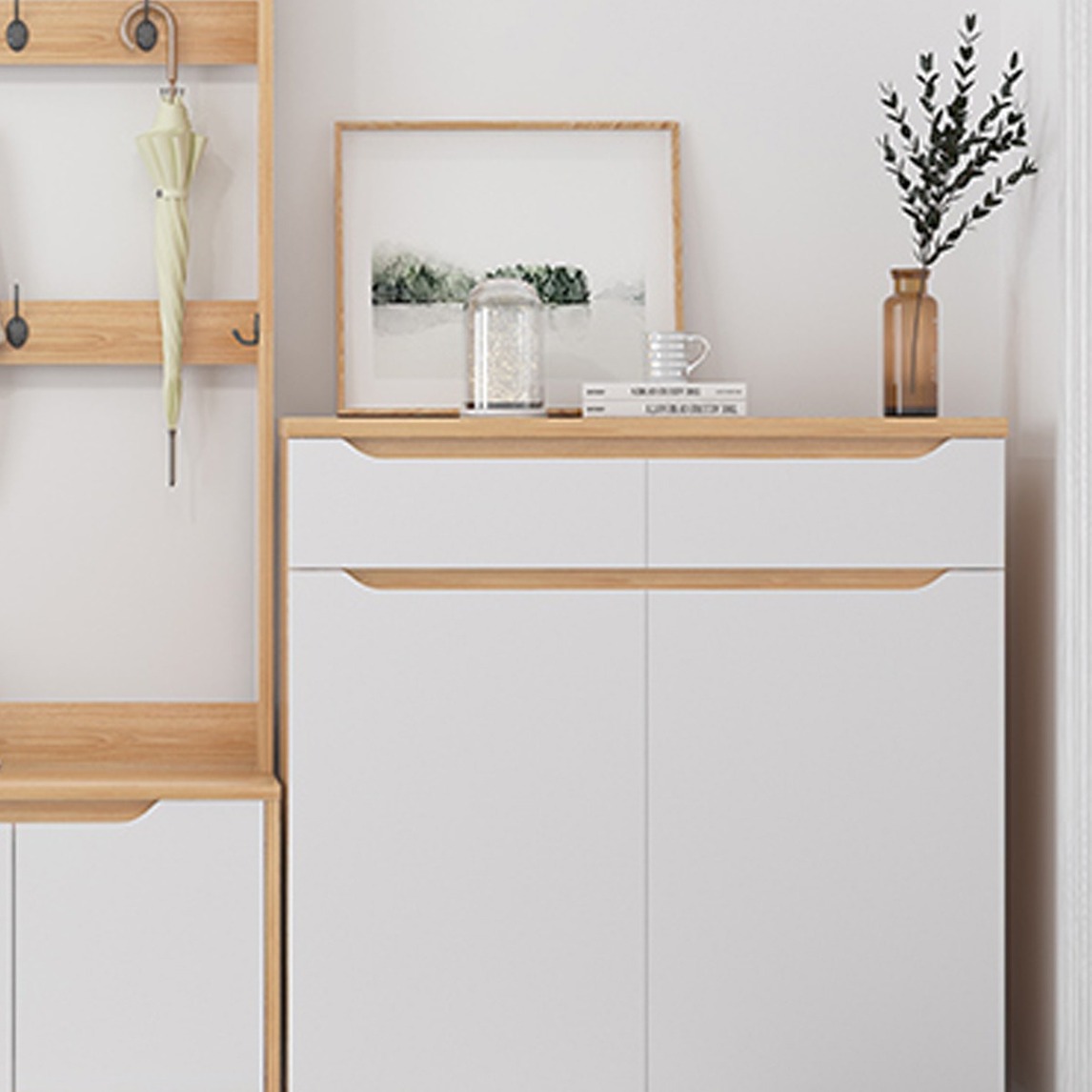 现在流行玄关柜在入户门口的位置,可以摆放一个玄关柜,或者进入室内在某个角落设计一个壁柜,或者是一个衣帽间,在衣帽间的上面放衣物,在下面就可以摆放鞋子