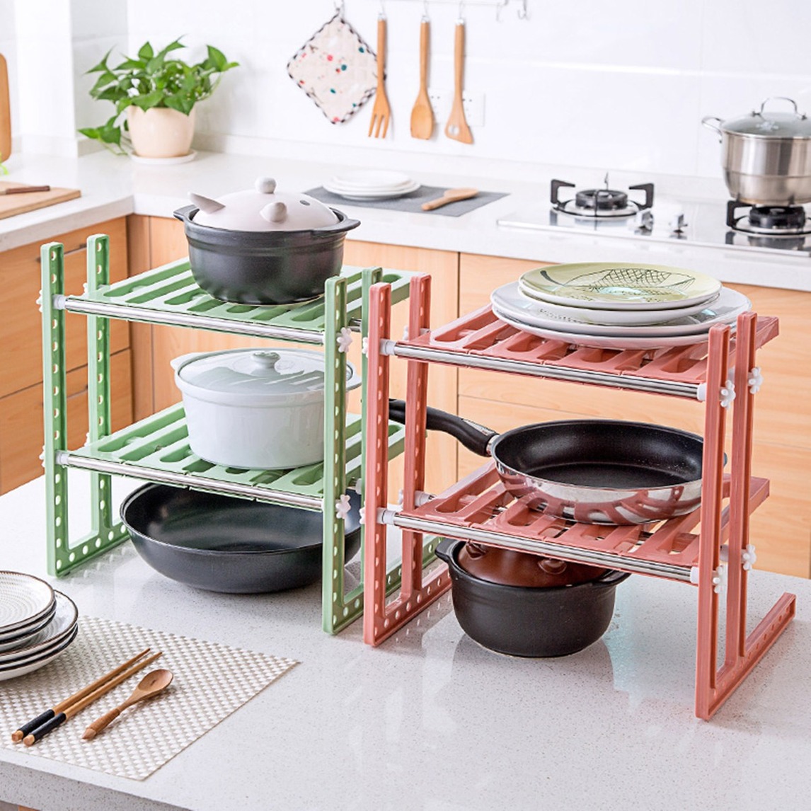 水槽下收纳置物架,可左右伸缩、上下调节,合理利用水槽下空间,收纳置物架,上下两层可根据物品大小自由调整。