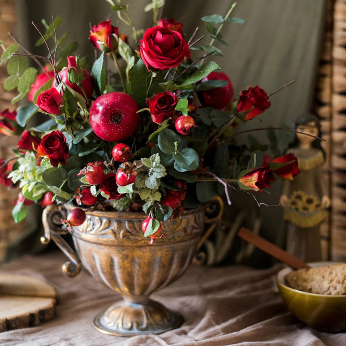 这个系列的花艺套装,太惹人怜爱,娇艳似火的玫瑰,红彤彤的大苹果,大大小小的组合着,和谐的热情,不断的洋溢出来,非常喜庆,且充满无限热情,这样的搭配,放在哪里,都是一束风景
