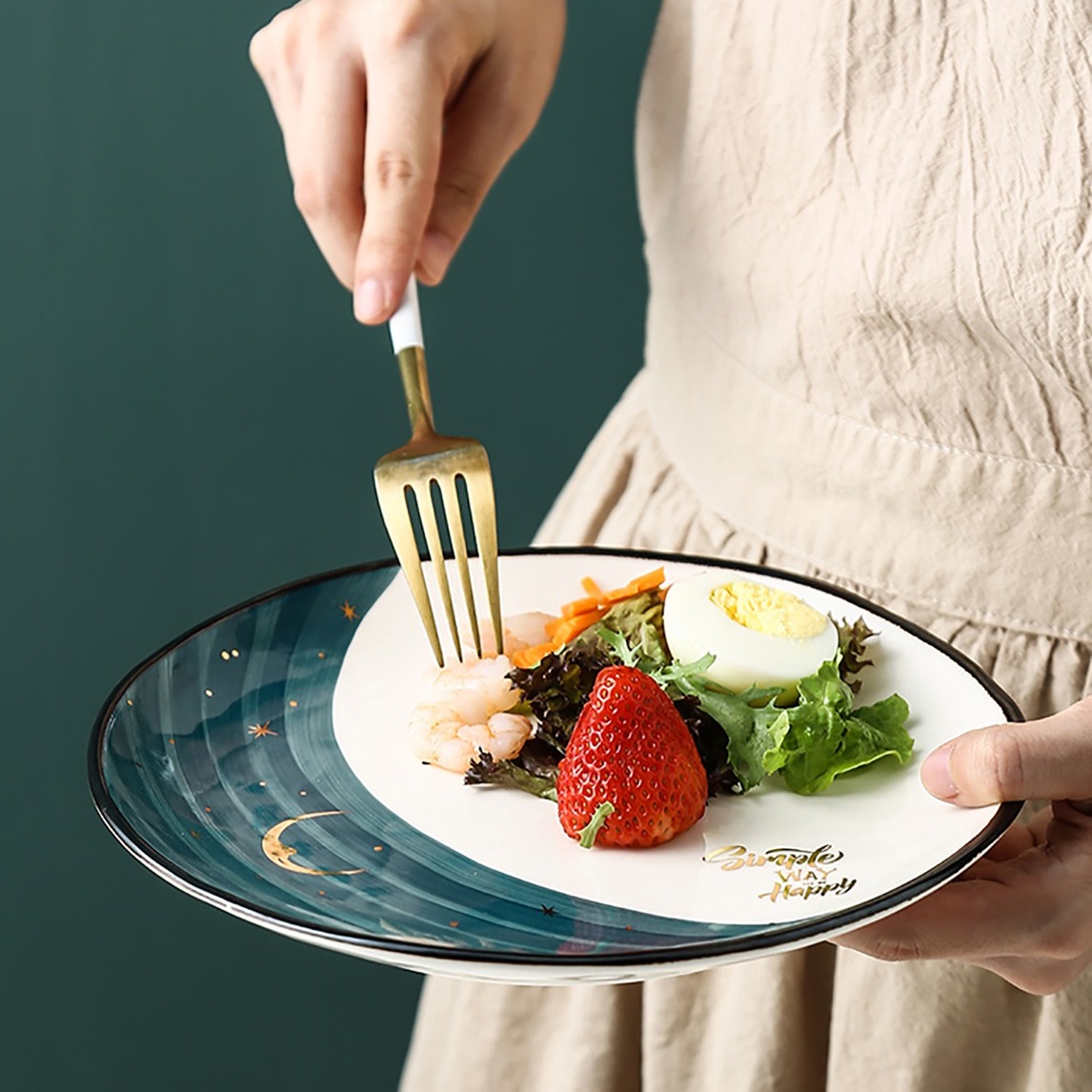 这一款餐盘,上面有星星月亮,乍一看上去,盘子里仿佛有着一整个星空,手绘图案,栩栩如生,精巧细腻,美轮美奂。