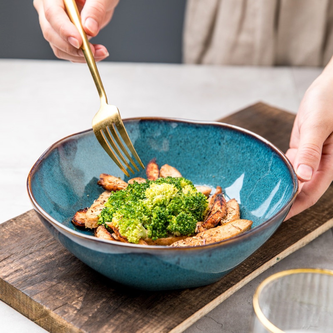 不规则荷叶碗,星空篮和喀青,两种风格各异的蓝色调,加入到食器中,对多种食材菜系有着很高的包容,也难怪这个系会一直火热流行至今,在家居配色中,是大家的爱用色之一。