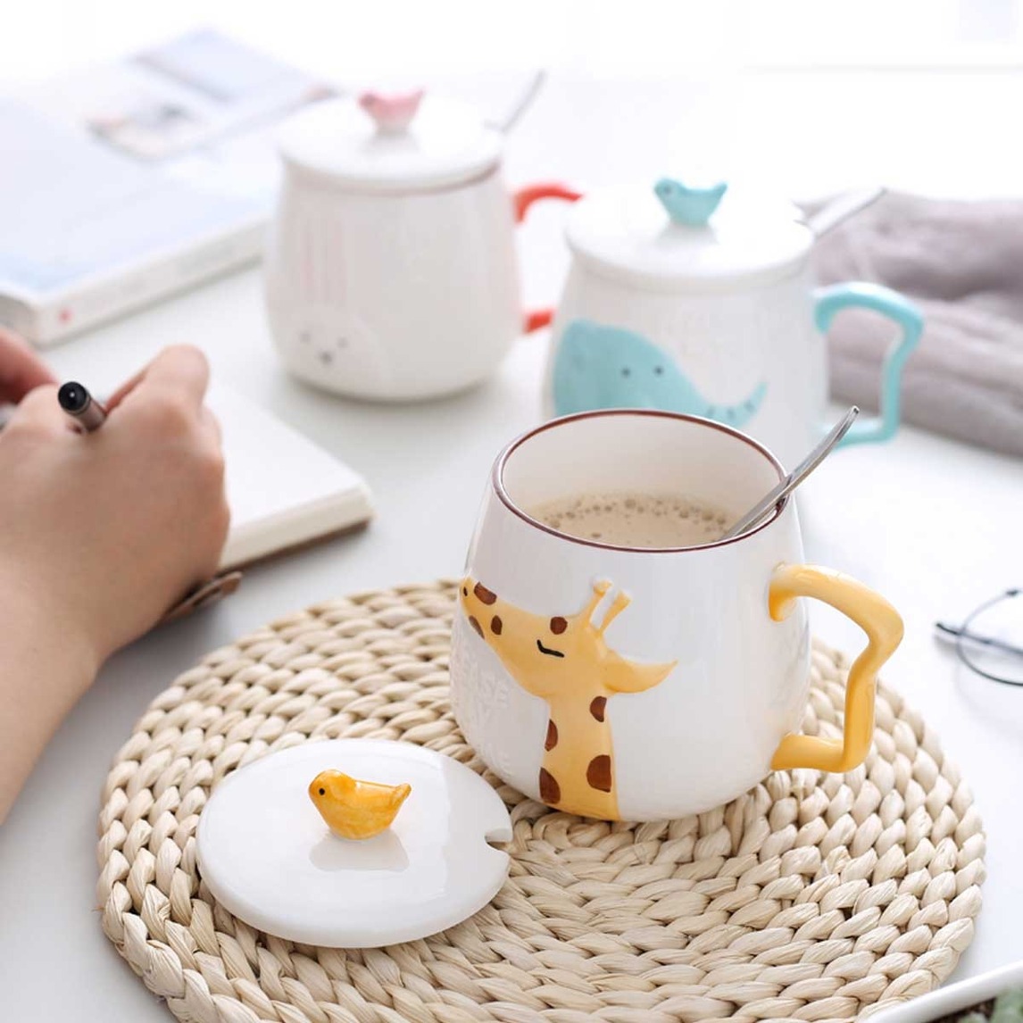 此款动物马克杯杯身浮雕设计。平浮立体动物,造型可爱。手工喷彩,健康釉下彩工艺。杯盖小鸟造型,回归自然的趣味,有效防止灰尘进入,干净卫生。