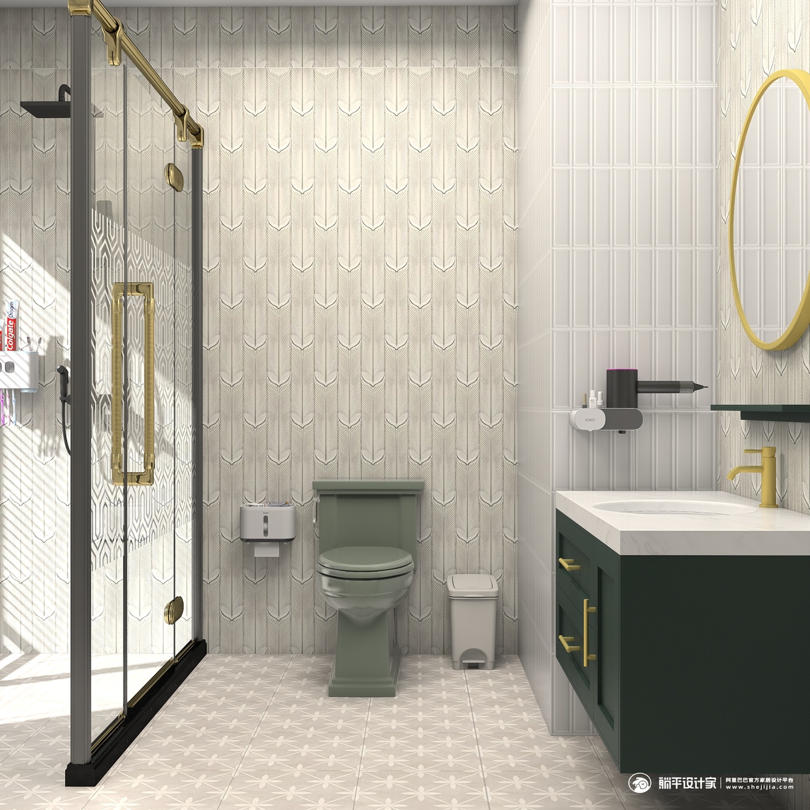 复古的金色配灰色黑色的搭配,整体复杂而且不乱,马桶搭配了一个复古绿的颜色比较适合,背景选用款3d的造型类似羽毛的铺贴方法