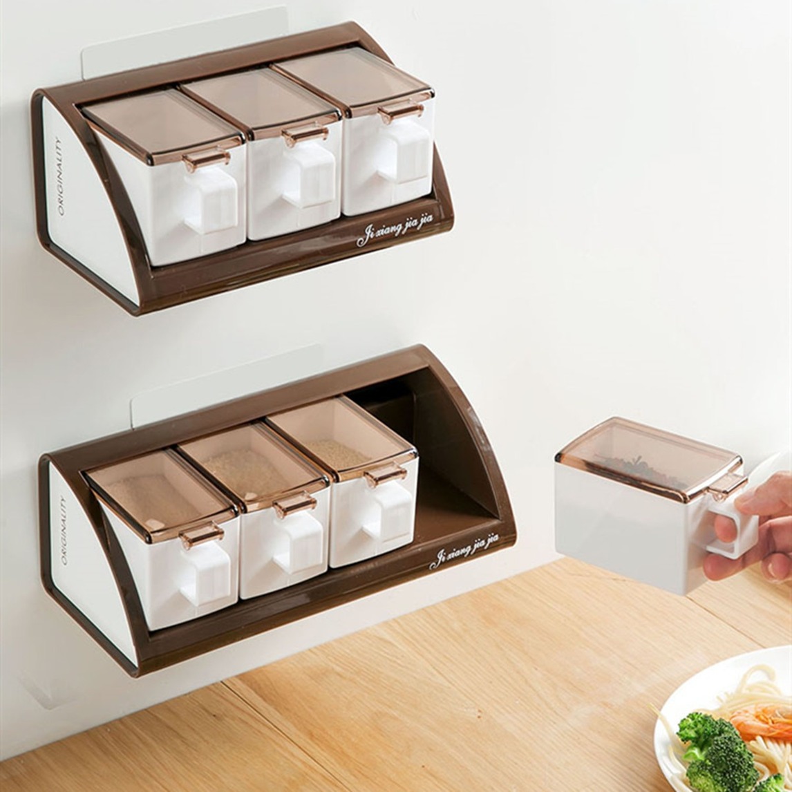壁挂式调味盒,可以分装不同的调味品,不易串味,透明盖子方便快速识别食材,不容易混淆,使用时不易拿错,轻轻一按,单手开盖。