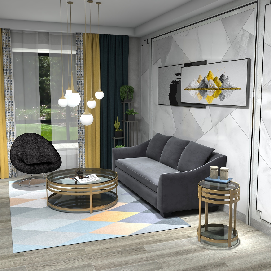 客厅布置要简约、舒适,整体以白奠定色彩基调。公共区域地面铺浅色系地毯,搭配白色系沙发,让空间显得简洁大方,明亮。
