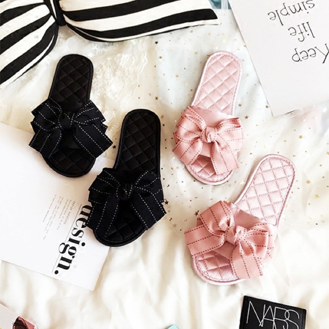 小香风菱格鞋面,搭配丝带蝴蝶结和line卡通, 大牌感十足!超级美美到没朋友,4色可选哦!鞋面使用仿真丝绸缎面料,触感真是舒服极了,配上美美的蝴蝶结,美不胜收!