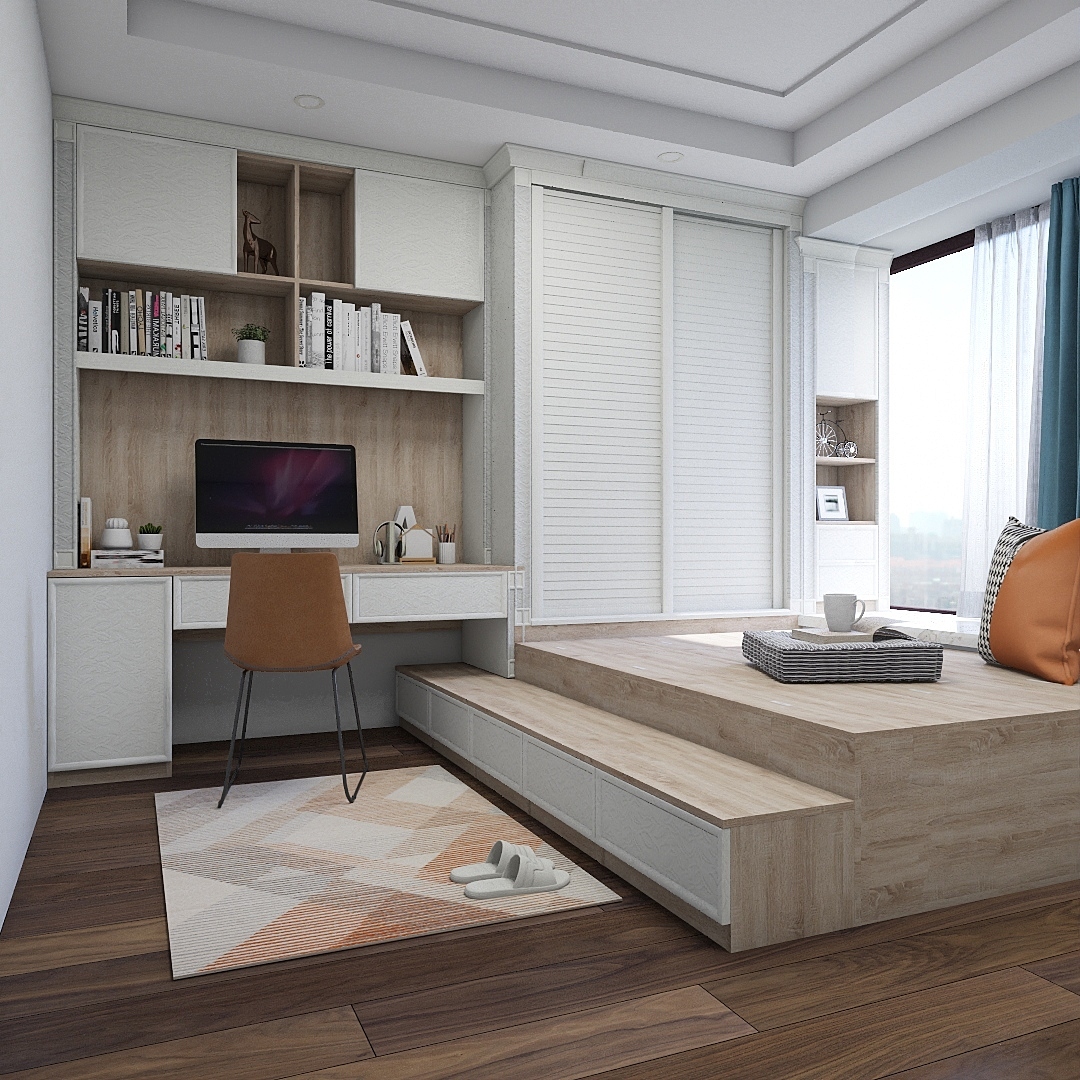 书桌+书柜+衣柜+地台床的榻榻米组合柜在追求舒适感的基础上,就可以把书房空间的利用开发到极致,满足的不仅是多功能需求,还比普通榻榻米收纳容量高一倍。