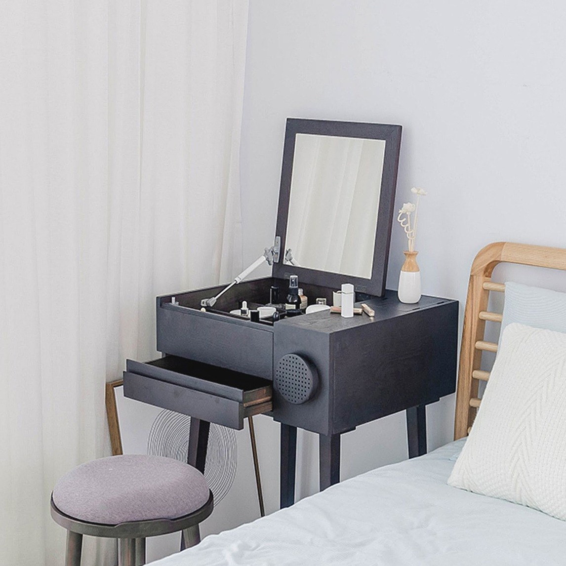 在浅色的实木床和白色的纱帘中间,是黑色的梳妆台,颜色和造型都有些偏硬朗,对比之下也能显出设计的用心。