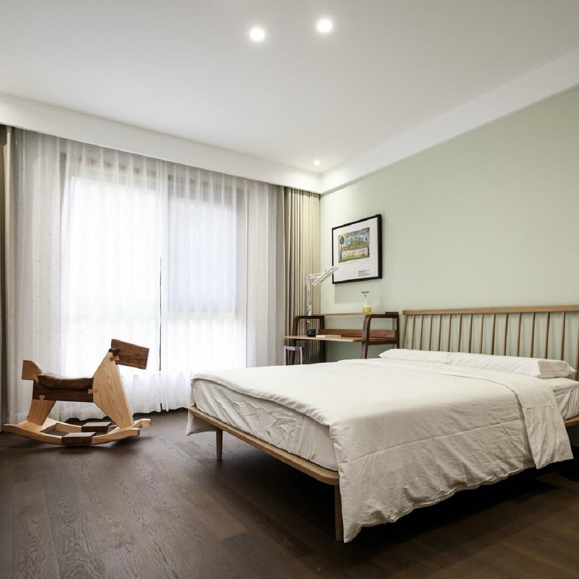 卧室采用了抹茶色墙体与米白色床品的搭配,同时落地窗旁边还放置着既可以作为装饰品,还能当作玩具的小木马。动画风格的儿童装饰画可以让整个卧室更显童趣,小台灯则可以作为孩子阅读时的照明工具。