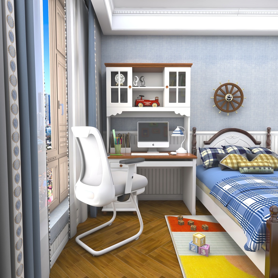 地中海的风格属于那种简单干净,越看越爱的那种风格。不需要太多点缀,但是总能给人舒服的感觉,书桌的选择也是地中海放个家具,家具的选择比较环保,转角部分也都是圆角设计,避免孩子玩闹中磕伤,真的很贴心。
