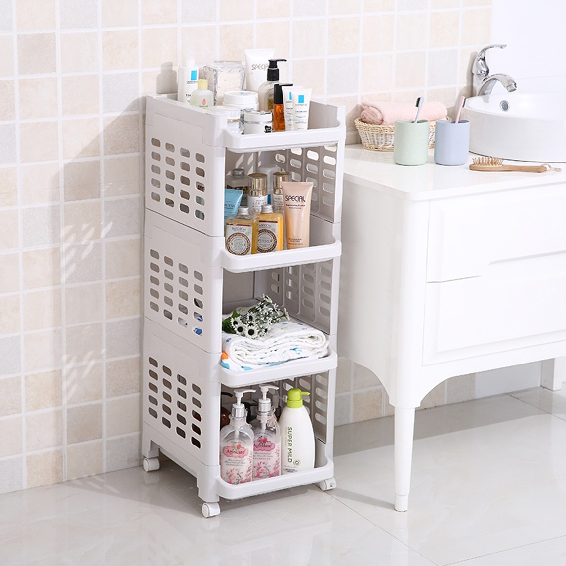 浴室多功能置物架,让生活变得井井有条,分层分类收纳杂物,让空间更整洁,底部万向轮设计,移动方便轻松。