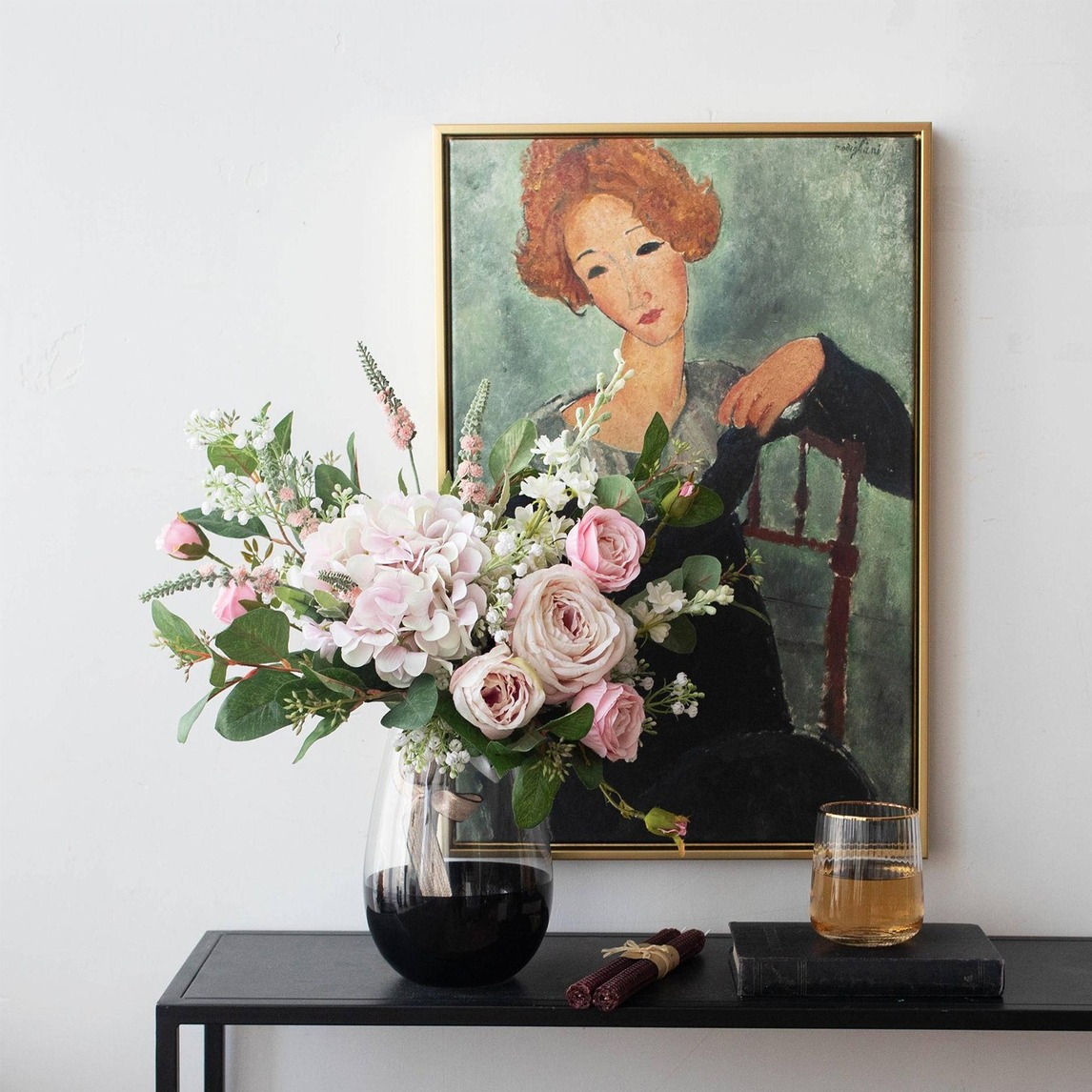 酷酷的灰色调背景和黑色玄关,似乎向人宣示着在这个燥热的世界里自己才是主角。玄关上,生机勃勃的复古绿装饰画巧妙地缀于空间之中,为其增添了生活温度。温柔的浅粉色花束柔柔的开放在花瓶里,带来别样的精致感。